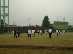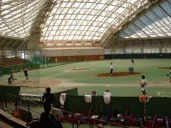 今回の試合会場は「天城ドーム」。天井が白くボールが見難い上に人工芝と、いつもとは全く違ったコンディション。グランドに慣れるためにも厳しくチェックしながらの練習。