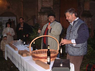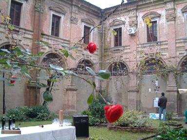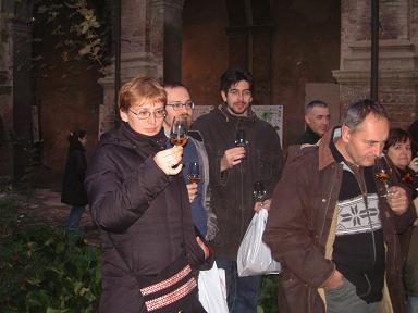 分かったようなフリをしながら(?)試飲するイタリア人たちと、ワインのテイスティングが行われた、教会の中庭。