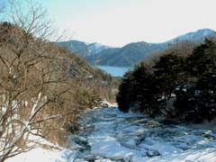 手前に雪の下を流れる澄んだ水の流れ、そのはるか遠くには中禅寺湖を見渡すことができる絶好のポイントだ。