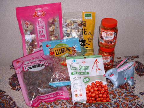 今回の購入品・・・上段左上から、ミックス花茶(各約200円)。菊やバラの花にクコの実などがミックスされ、一袋ずつに小分けになっているので便利。唐辛子系のお菓子(約100円)これもやみつきになる味。製造元によって味が違うが、おすすめはお姉さんマーク!下段左から、干し梅のお菓子・サンザシの砂糖菓子・ナツメの菓子(低糖!)いずれも50円~80円と格安。