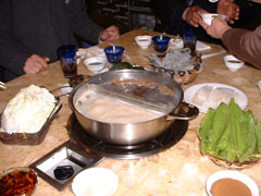こちらは、しゃぶしゃぶの夕食。お店自体が博物館のようになっているレストラン。置いてある物はすべて年代ものばかり。スープは辛口と普通味の2種類で、肉はマトン。野菜もほうれん草・白菜・レタス・大根・瓜とバランスも抜群。タレはしょうゆ味とゴマ味があったが、ゴマ味にパクチーを加えた物がおすすめ。