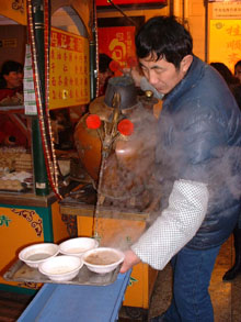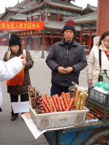 甘栗についでおすすめなのが「サンザシ」。サンザシをくしにさして、その周りを飴でコーティングしたものがよく売られている。飴のパリパリ感とサンザシの甘酸っぱさの組み合わせが絶妙で、これもやみつきになる味。日本に持ち帰れないのが何とも残念!もうひとつは、食品街で見つけた屋台。カップの中になにやら粉(いろいろ種類がある)のようなものを入れて、大きな瓶から一気にお湯を注ぎ込む。好奇心を押さえきれず食べてみると、固めの葛湯のような感じだった。味は無難に杏仁味をチョイス。寒い冬に、身体の芯まで温まるホットなお菓子は大人にも子どもにも大人気。