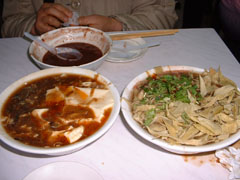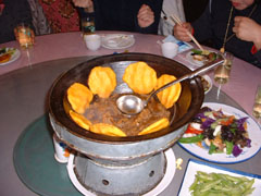 天津料理のレストランでの一品。鍋の周りに張り付いているのは、とうもろこしの粉て作ったナンのような物。これを鍋の真ん中に入っている魚のスープにつけて一緒に食べる。魚のだしの効いたスープとモチモチ感がベストマッチ。名物というだけあって、気が付くと、ほとんどのテーブルで注文されていた。