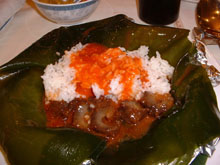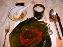 運ばれたお皿の昆布を開くと、ナマコの姿煮が登場(写真左)。これを小さくきり、白米を混ぜ、あわびのソースをかけ(写真右)て混ぜていただく。ナマコのぷりぷりとした感じと、ご飯とソースの濃厚な味が絡み合って絶妙のコンビネーション。これには参った!食は中国にありを再度実感した旅となった。ごちそうさまでした!