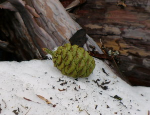 種は、種として成長するのに2年。そのまま20~30年間木の上で待ち続け、やっと下に落ちる。でもそのままでは発芽しない。乾燥して種が出てくる。なので、山火事で焼けることでやっと芽を出すことができるのだ。
