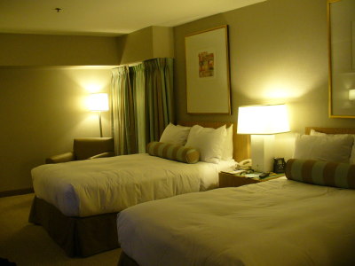 このホテルは、ヒルトンなのに意外と安く泊まれる。もちろん設備はしっかり、サービスも良い。ジェット機の音(においも)を感じながら、スパや温水プールにも入れる。空港からとても近いのでパイロットやスチュワーデスの姿が目立った。この日、3人で9400円。1人3000円ちょっとでこの部屋とは、かなりのお得感がある。帰国直前まで街中で遊びたい場合には向かないけれど、レンタカーがある場合や、ロス到着が遅く翌日の出発が早い場合などにはお勧めだ。