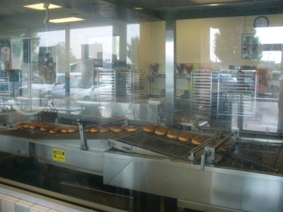 朝8時なのにお客さんがいっぱい。お店の中で、機械で作られる様子が見れるようになっていて楽しい。