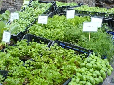 バジルやセージ、パセリといったハーブ類の鉢植え、