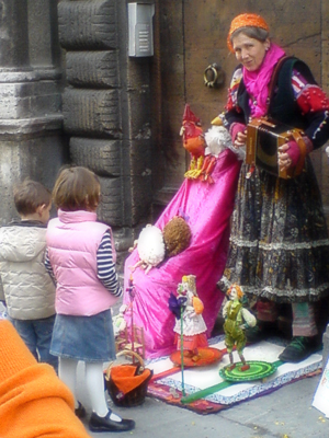 カラフルな衣装をまとって人形を躍らせながら