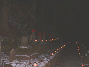 今年のろうそくの数は3000本とのこと。静かに並んだお地蔵さまたちを、キャンドルの暖かい灯りが照らし出す。