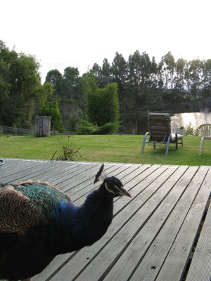 こちらは、エサ欲しさに、ずっと家の中を覗いている孔雀です。