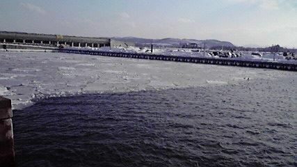 今日は快晴で、またとない観光日和である。太陽が明るく輝く中、紋別港には穏やかな春風が吹いていた。港湾内には流氷の残骸が薄氷を張り、残っている。