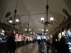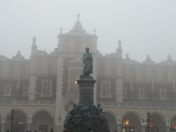 その後ろには優美な織物会館。霧で色合いが分からないのが残念ですが、クリーム色と茶色のツートーンカラーです。もともと布地の取引をしていたので付いた名ですが、今は国立美術館も入るクラクフ観光の中心拠点です。
