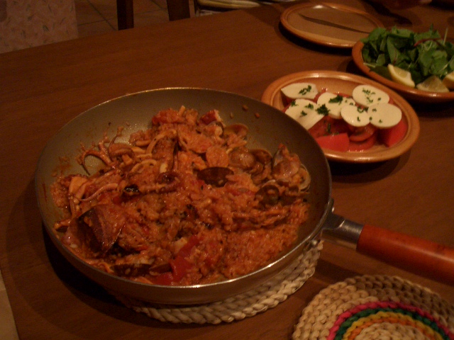 新鮮な伊勢の海の幸を使って料理しようと近くのスーパーに立ち寄ったけど、あまり地場のものを置いてなかった(ジャスコに行ったからしょうがないか?)。でも地元産のあさり・どこ産か忘れた剣先いか・タコ・ホタテ・トマト・モッツアレラチーズ・ルッコラなどの葉っぱものなどなど