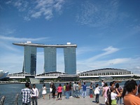 マーライオン公園の隣、フラトン・シンガポール前のワン・フラトンの真正面に、マリーナ・ベイサンズ・ホテルの遠景が美しく見えます。ここからマリーナ・ベイサンズの記念写真を撮ることをお薦めします。