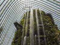 やや背の高い方のドーム、クラウドフォレストには、湿度の高い熱帯地域の山岳植物が展示されています。高さ35mの小山から人工の滝が流れ落ち、清々しいミストが発生し、涼しく快適です。
