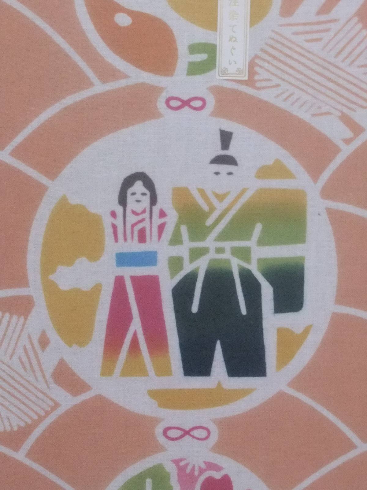 金屏風の前の立雛置いて、お雛様の図柄の手ぬぐいは額に入れて