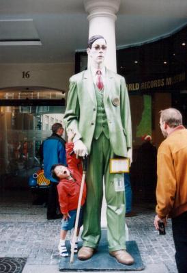 夕方には、世界最大の歩行者天国と言われる(?)ストロイエの中にある「ギネス博物館」へ。入り口には、世界一背の高い人の等身大の人形があった。