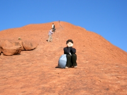エアーズロックって、実は意外と登れないことも多い(登山道がしまっている)そう ですね。いくつかの条件があって、それらをクリアしていない時は登山道がしまってしまうそうで、夏は気温、冬は風の条件が引っかかりやすいとか・・・。私たちが行った日は晴天で、冬にしては気温も高く(といっても全然暑くはありません)、登山にはもってこいの日だったようです。ついてました。もちろん、登山にチャレンジ!!しかし、私は偏頭痛と足の痛みに負けて途中で断念..。ん~ん、...すっごい悔しいです。でも、友人はしっかり頂上まで登ってきました。その間、私はエアーズロックのくぼみに腰を下ろし、晴天の空や、遠くに見える地平線とそこに浮かぶように見えるカタ・ジュタに見とれながら、一人でのんびり昼寝なんかしてみたり。それはそれで、何ともいえない不思議な時間を過ごし、とても気持ちが良かったです。