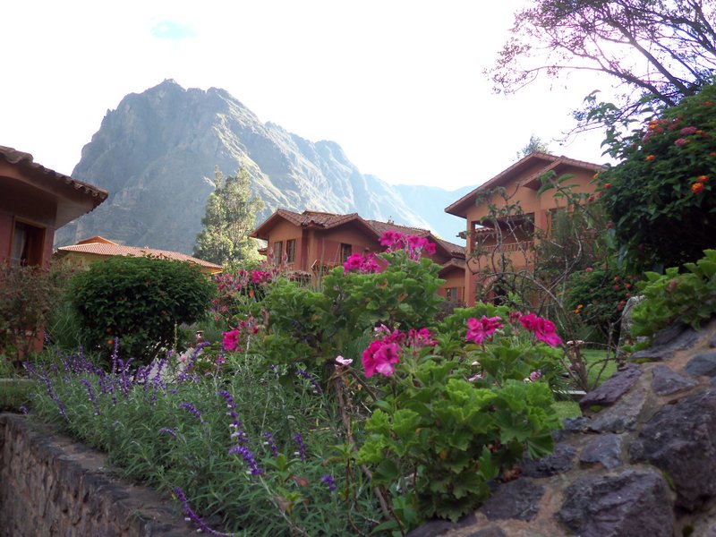 写真2段目左:オリャンタイタンボの宿 右:夕焼け時のマチュピチュ