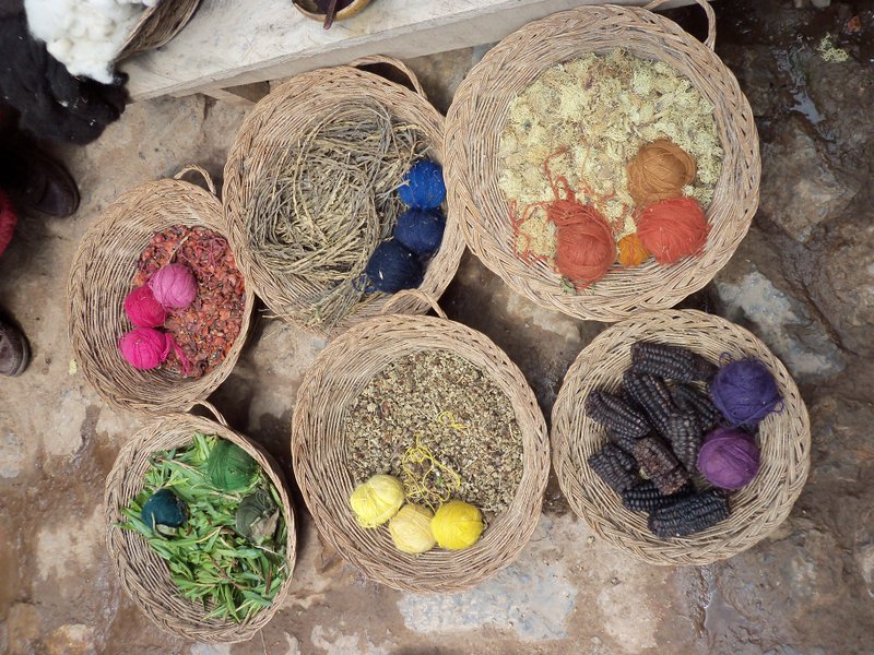 写真1段目左:インカ道から見るマチュピチュ 右:チンチェーロ村にて様々な染色