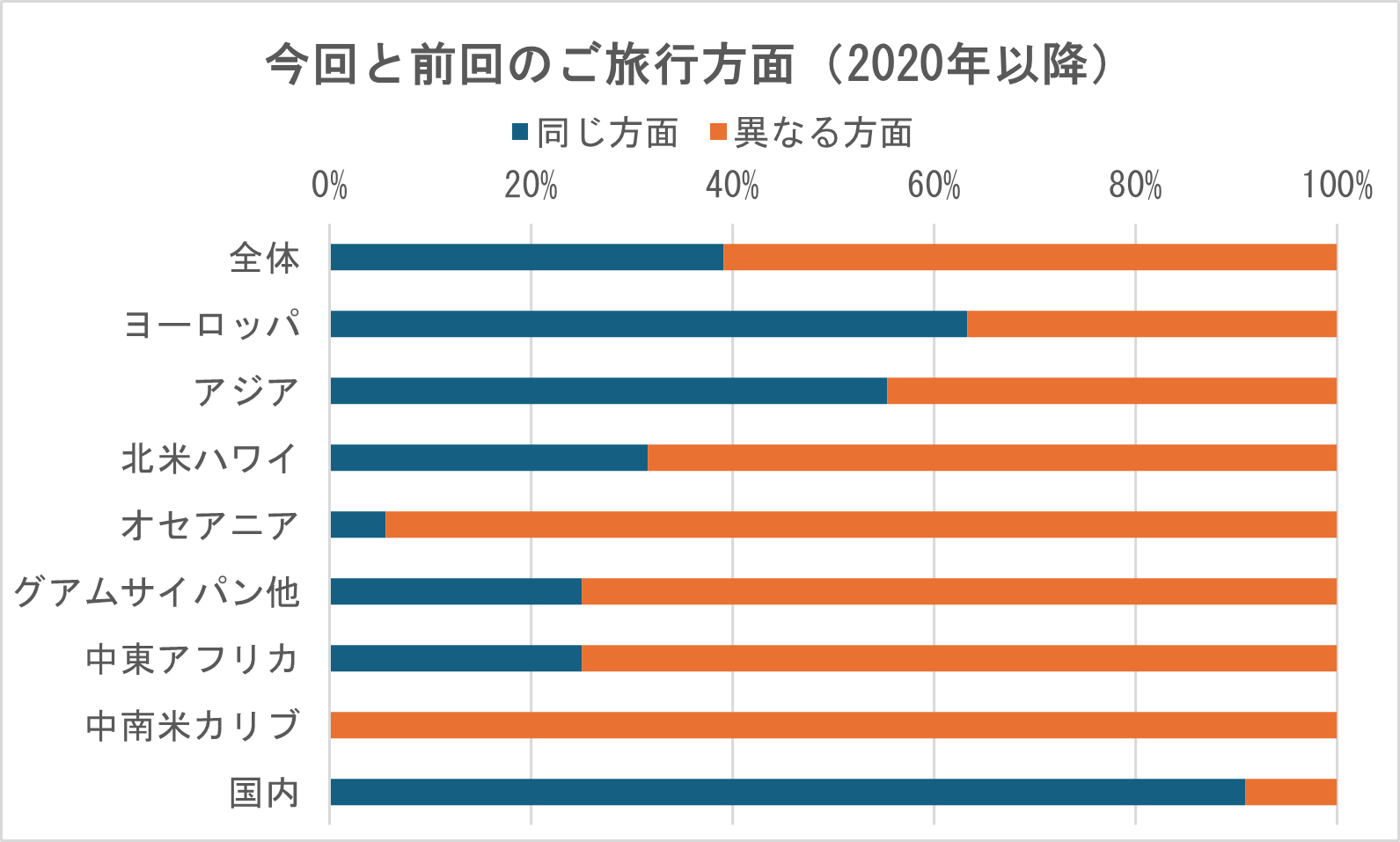 2020年以降のデータを見てみると、少し変化が見られます。 まず、全体の傾向として、同じ方面でご利用いただく方の割合が少し下がっています。 40%を少し切るくらいで、コロナ禍前の期間と比べると10%ほど下がっていることがわかります。 コロナ前は同じ方面のリピートが7割を超えていたヨーロッパは6割強まで下がっています。 例えば、コロナ前はヨーロッパしか行かなかったという方も、コロナ後は国内旅行などでもご利用いただいたり、もう少し近場の海外へお出かけになっているご様子がうかがえますね。 航空券や物価高騰の影響が、こういった方面の選択にも影響を与えている、と言えそうです。 逆に言えば、今まで毎年ヨーロッパに出かけていらしたような方も、1回はヨーロッパ、次は少し近いアジア、また次の年はヨーロッパ、など、うまく方面を組み合わせることで、トータルで見れば、ご旅行の予算を変えずに海外旅行の回数は重ねられるとも考えられますね。 |