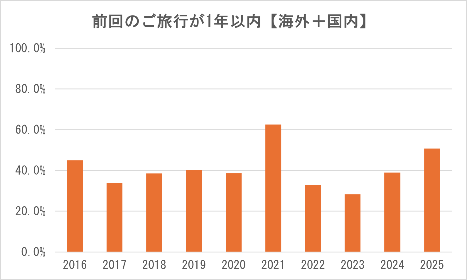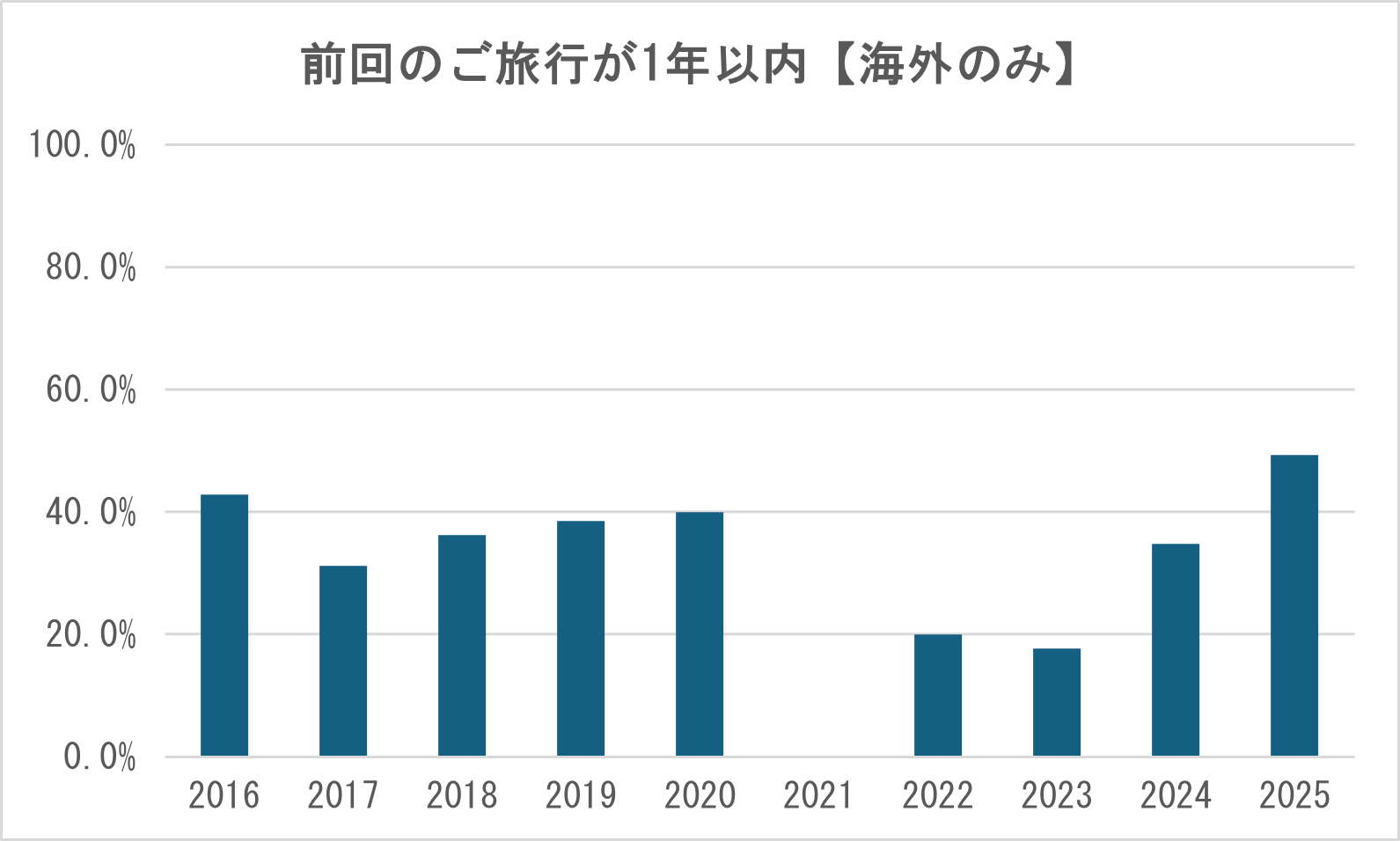 続いて、前回のご旅行との間隔のデータを1年刻みで取ってみました。 最初のデータで、ご旅行の間隔はコロナ前よりも空いている、というのがお分かりいただけたと思いますが、1年以内に再度ご旅行にお出かけくださっているお客様の割合は、2023年以降一気に増えてきています。 2025年にはコロナ前の割合を上回り、リピーター様の約半数が1年以内にリピートしてくださっていることがわかります。 これは、コロナ明け初めてご旅行へお出かけいただくお客様もまだまだ多い一方で、コロナ後にすでにご旅行にお出かけいただいたお客様が、再度1年以内にご旅行に行かれるという方が増えてきていることを示しています。 海外に絞ってみても同じ傾向が見られますので、コロナ明けに一度海外へ出かけた方は、比較的すぐに次の旅行をご検討・お申込みいただく傾向があることがわかります。 |
