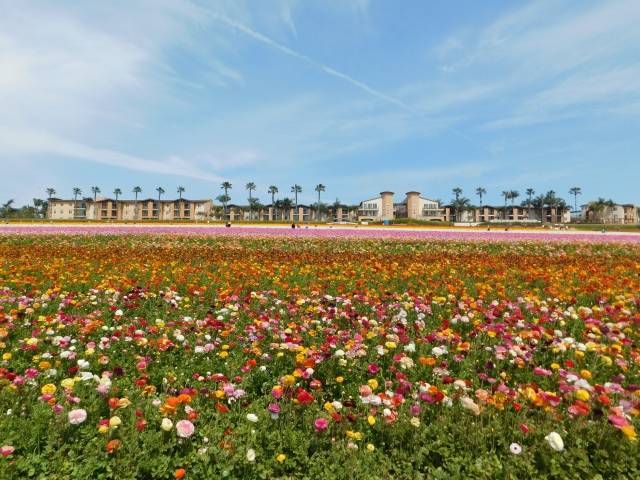 ラナンキュラスは幾重にも重なった、華やかで明るい花弁が目を引く球根植物。 東京ドーム4個分を超えるエリアに、赤・オレンジ・白・ピンクなど色とりどりのラナンキュラスが整然と咲き誇り、見る人の視界を埋め尽くします。 カールスバッドは、ロサンゼルスとサンディエゴの間にあり、ロサンゼルスからは車で1時間半ほど。 温暖なカルフォルニアに春を感じに行くのもよさそうですね。 |