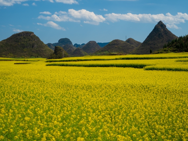 中国雲南省の羅平では、一面の菜の花畑が春の訪れを告げます。 その面積、なんと東京都を超えるほど。 中国南部に多いカルスト地形の奇鋒と鮮やかな黄色の菜の花の対比に、大自然の妙を感じます。 約4㎞の間に10段の滝が連なる九龍瀑布や世界遺産の奇観・石林と合わせて訪れるのが人気です。 |