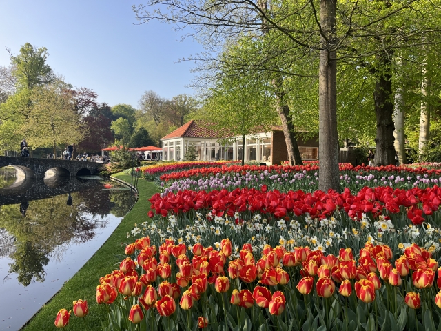 アムステルダム郊外の町リッセにあるフラワーパーク「キューケンホフ公園」。 世界最大級の花の公園にも関わらず、開園するのは3月中旬~5月中旬の2か月間のみという、期間限定の公園です。 見どころは何と言ってもチューリップ。 チューリップと同じく球根のスイセンやヒヤシンスなども植えられ、開園期間中は世界中から多くの観光客が集まります。 |