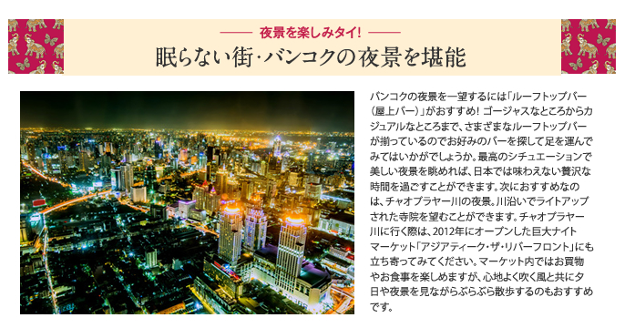 タイに一度行くとリピーターになる方が多いようですね。 いろいろな楽しみ方ができる国なので、自分らしい過ごし方を見つけるのがタイを満喫する近道かもしれません。 夏休みは微笑みの国でおもいっきり羽を伸ばして、日頃の疲れを癒やしてみてはいかがでしょうか? |