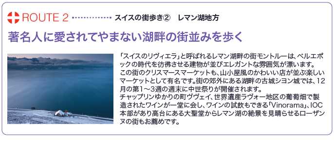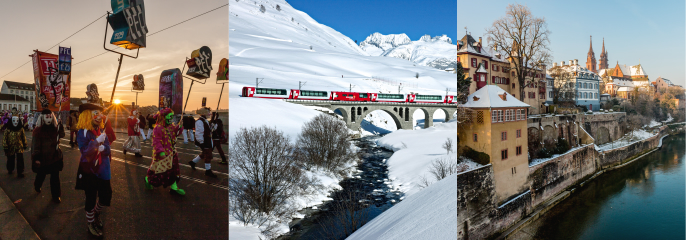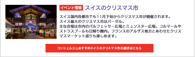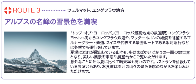 ツェルマットを筆頭に、スイスの山岳リゾートは、冬はスキー、スノボを楽しむ人たちで大変な賑わいを見せます。 しかし、そういったウィンタースポーツ抜きでも楽しく過ごせるのが、観光立国スイスの懐の深いところです。 スイスの冬を、街で山で体感しましょう。 |