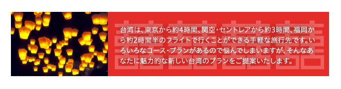 ![]() 台湾大好きという方が増えています。 近くて行きやすいので、何度も行けると考えれば旅行プランも欲張りすぎず、ゆったりしたものにできますね。 最初は台北市内だけ、あるいはプラス九份ぐらいにとどめておいても、次はどこに行こうか考える楽しみがあります。 |
