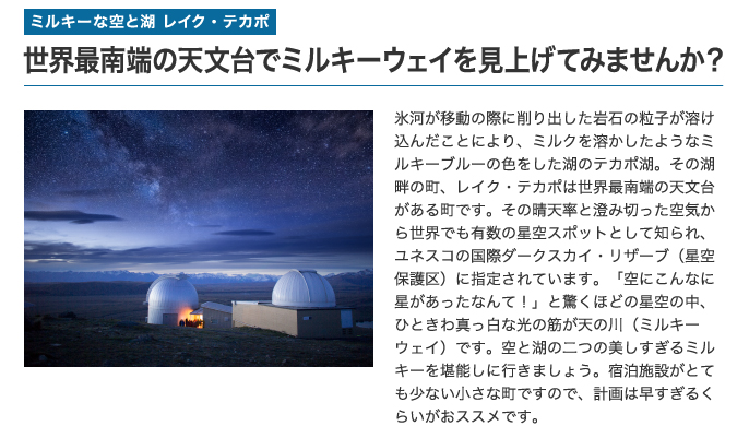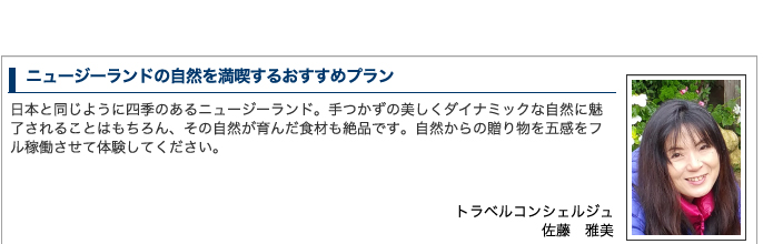 ![]() 南半球に位置するニュージーランドは、日本と季節が逆転します。 日本の暑い夏に旅立てば現地は冬、逆に日本の冬に出かければニューがジーランドでは夏を迎えます。 雄大な自然が魅力の国ですが、日本と全く異なった季節を感じることができるのも、魅力のひとつといえるでしょう。 |