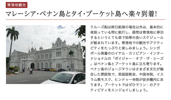 ![]() ヨーロッパでは、夜間に航行し昼間は寄港地で観光をするリバークルーズが人気です。 ホテルの部屋ごと移動するようなものなので、荷物をパッキングする必要がありません。 この利便性を航海で実感できるのが、アジアクルーズです。船上の楽しみも多様で、飽きることがありません。 楽しい旅が期待できます。 |