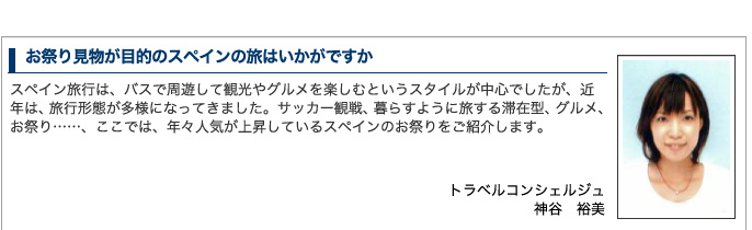 ![]() テレビのバラエティ番組で、パンプローナの牛追い祭りやブニョールのトマト祭りを見たことのある方もいらっしゃると思います。 さまざまなお祭りが開催される、情熱の国スペイン。そのお祭り見物を、旅のプランに組み込んでみてはいかがでしょうか。 |