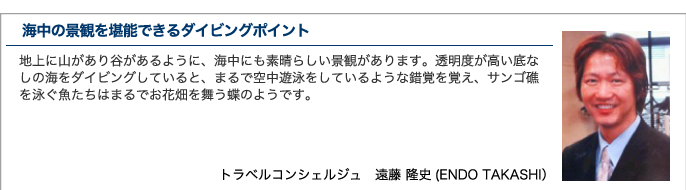 ![]() スクーバダイビングやスノーケリングのように目的がはっきりしている旅行は、行き先の選択が旅行の成否を大きく左右します。 今回ご紹介したパラオ、グレートバリアリーフ、ボホール島はどれも太鼓判を押してお薦めできます。 |