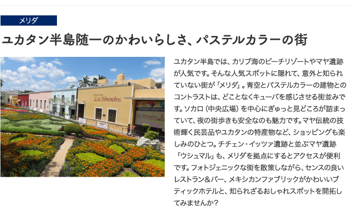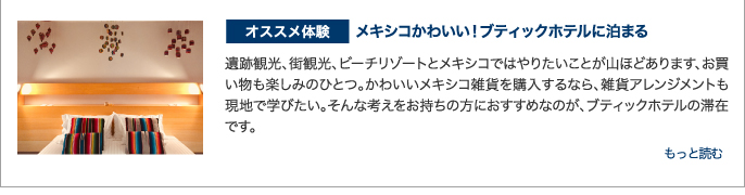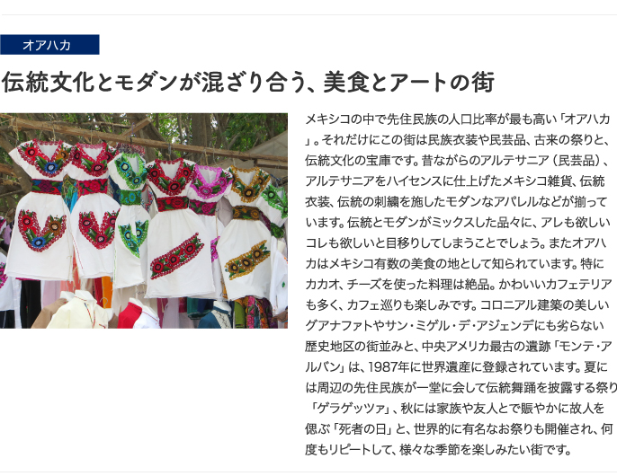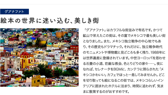 ![]() カラフルな街並みとかわいい雑貨。 女子の心をがっちりつかむ魅力の数々は、これまであまり注目されてこなかったメキシコの側面です。 インスタ映えスポットも多数あり、フォトジェニックな旅を実現できます。 |