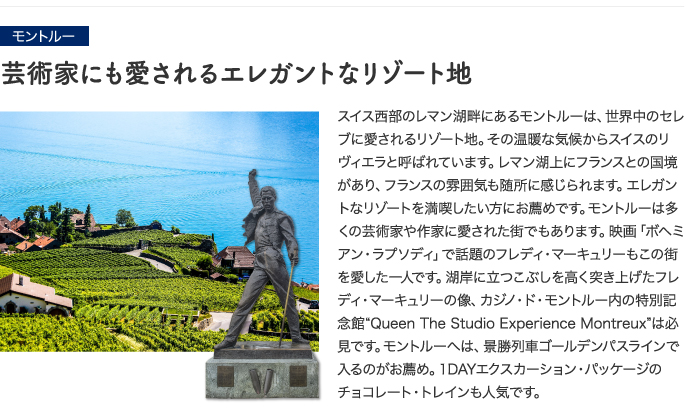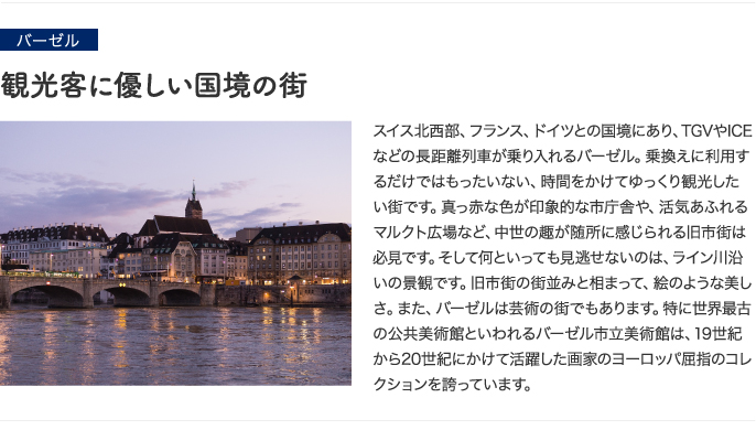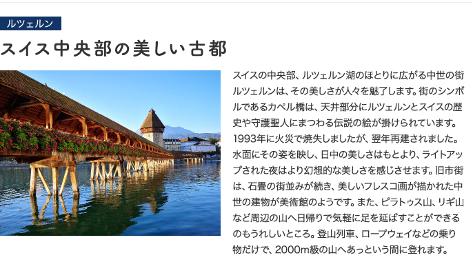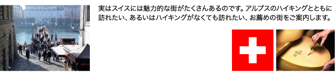 ![]() 冬はウィンタースポーツ、夏はハイキング・・・、スイスの山岳リゾートは世界的に人気ですが、山岳観光の拠点となるベースタウンや国境の街など、街歩きも思いのほか楽しめます。 古都、リゾート、商業都市など、お好みに応じてチョイスできます。 |
