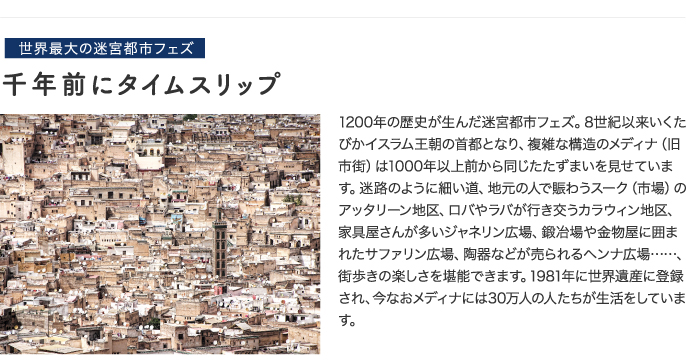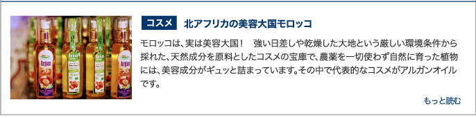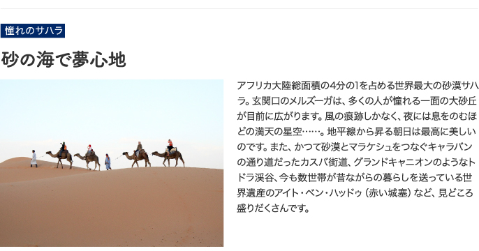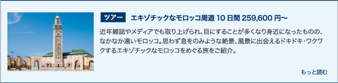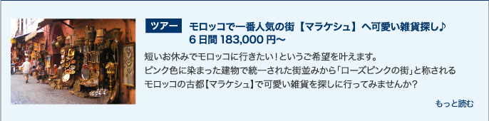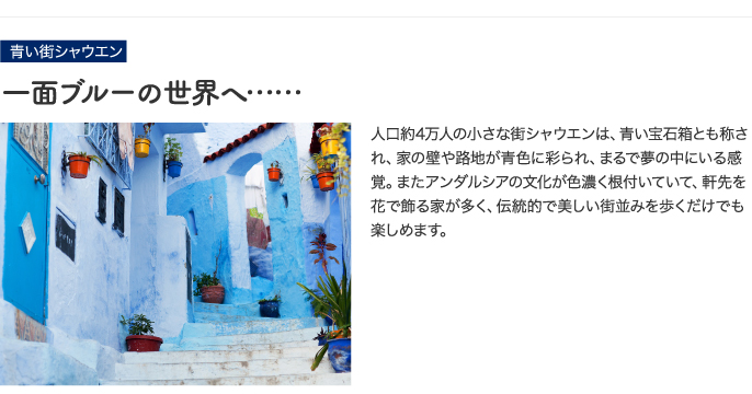 ![]() ヒッチコック監督の「知りすぎていた男」、ハンフリー・ボガート主演の「カサブランカ」など、年配の方には映画でなじみのこの国も、今では青と猫と花の町シャウエン、絨毯スークのマラケシュなど、インスタ女子の撮影地として大人気です。 |