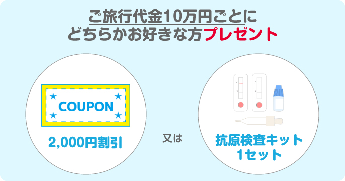 すでにワクチン接種を済まされたお客様など、抗原検査キットが不要な方には、旅行代金の割引もお選びいただけます。